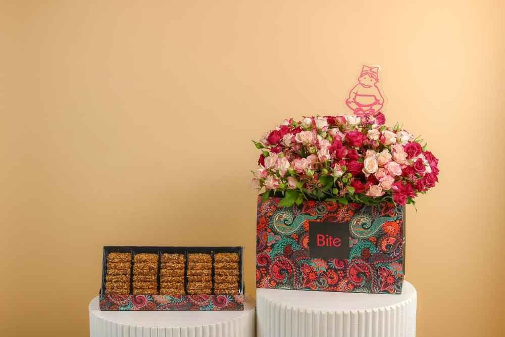 نسيق هدايا أنيق يجمع بين الفخامة والحيوية، حيث تزين باقة ورد طبيعي مفعمة بالألوان صندوقًا مزخرفًا بتصميم شرقي فاخر من علامة Bite. التنسيق يتضمن: