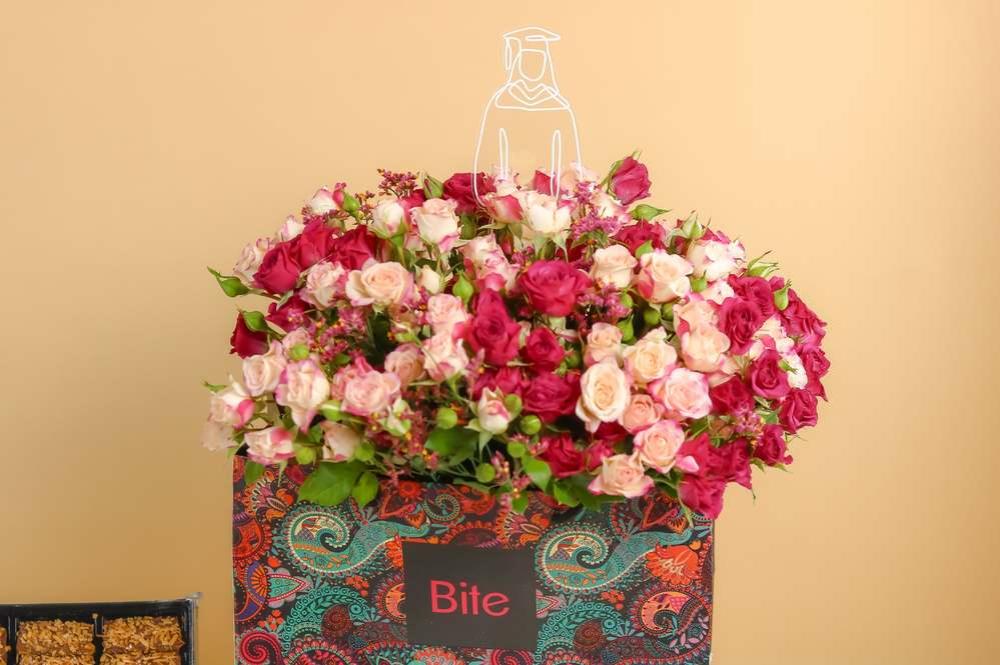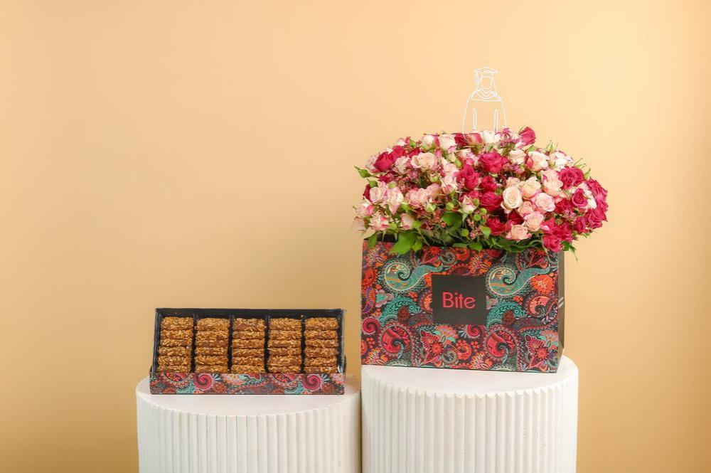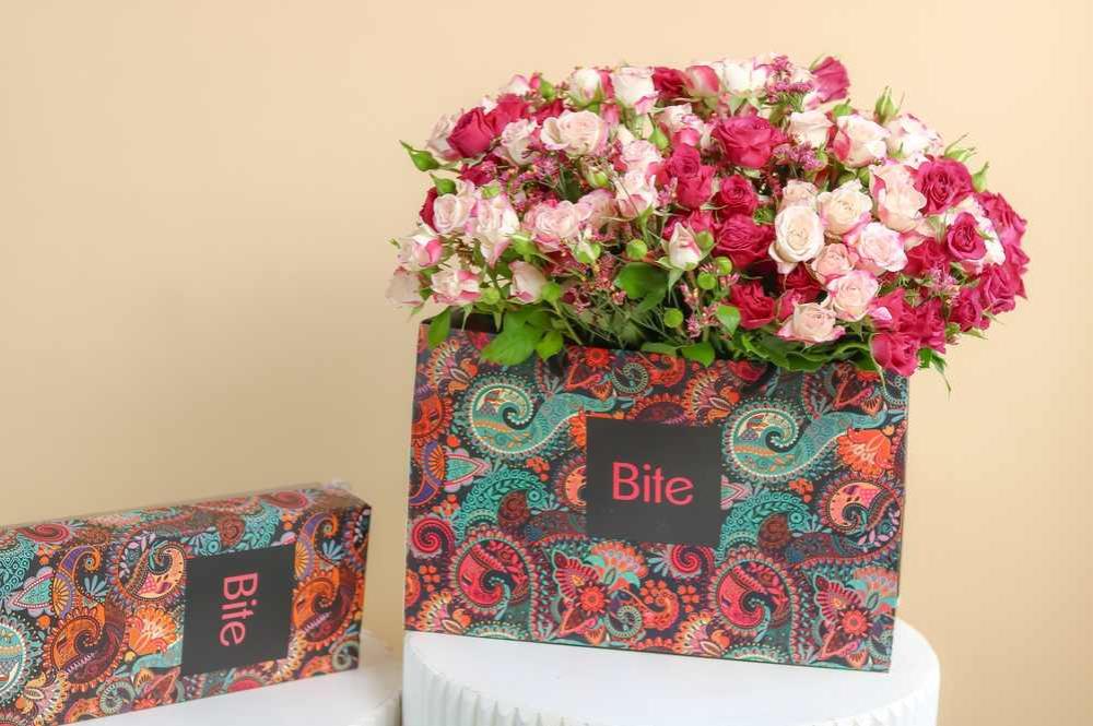 نسيق هدايا أنيق يجمع بين الفخامة والحيوية، حيث تزين باقة ورد طبيعي مفعمة بالألوان صندوقًا مزخرفًا بتصميم شرقي فاخر من علامة Bite. التنسيق يتضمن: