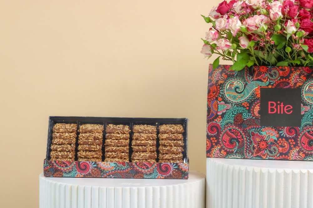 - علبة شوكولاتة فاخرة من "Bite" بنفس التصميم الشرقي النابض بالألوان.