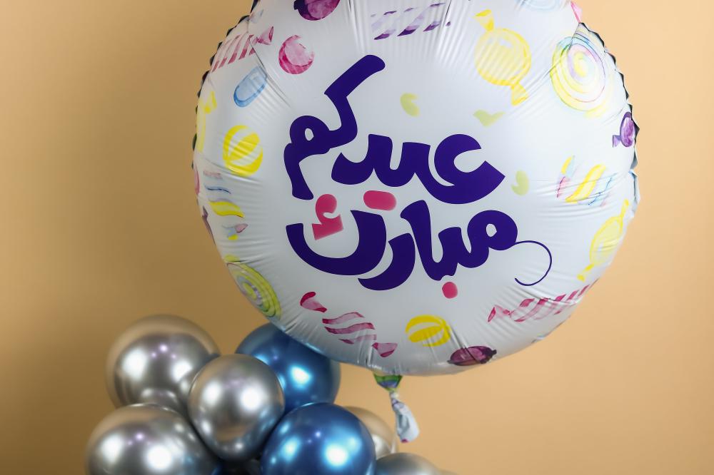 ✨ بالون هيليوم كبير يحمل عبارة "عيدكم مبارك" بتصميم جذاب ومرح.