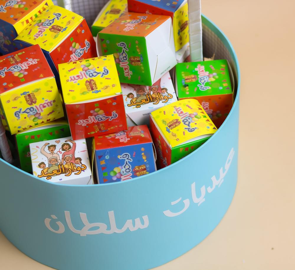 🎁 بوكس دائري أنيق يحتوي على هدايا صغيرة و"عيديات" مناسبة للكبار والصغار.