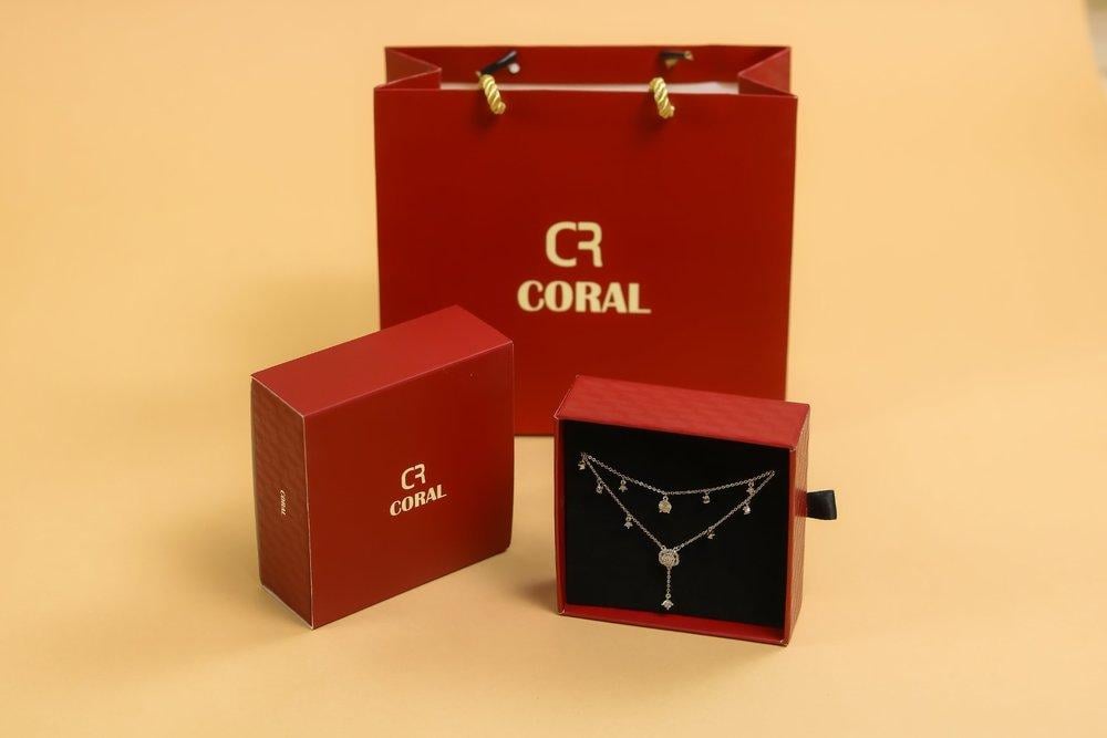 - العلبة: تأتي مع علبة حمراء فاخرة تحمل شعار كورال.
