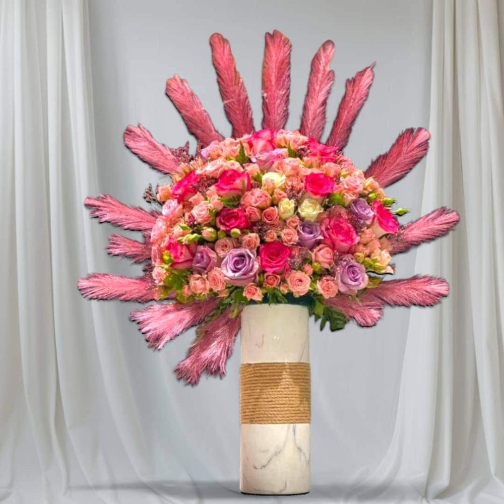 فازة رخامية أنيقة تحتوي على مزيج من الزهور الوردية الطبيعيه والريش، مما يجمع بين الأناقة والرقي. تتميز الباقة بالتالي: