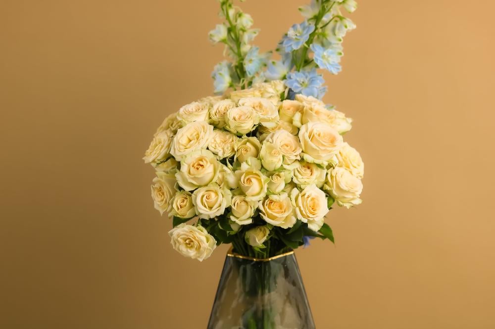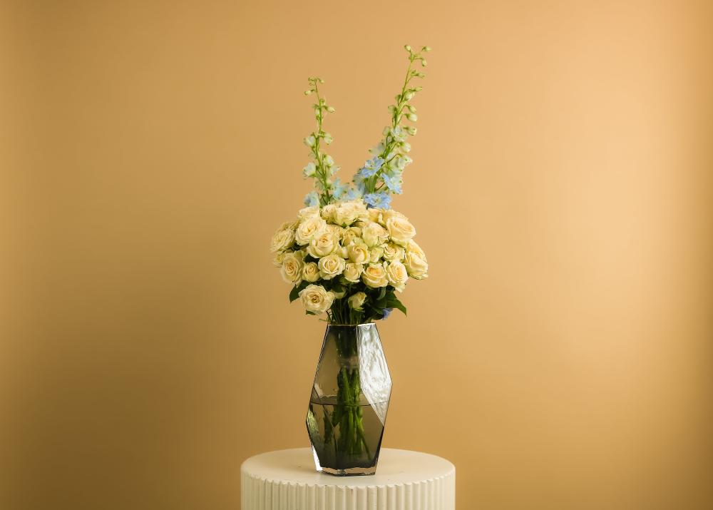 تنسيق ناعم داخل فازة زجاجية شفافة يضم بيبي روز بلونه السكري الهادئ مع دولفنيوم سماوي يضفي لمسة من الصفاء، ليكوّنا مزيجاً أنيقاً ومريحاً للعين. مثالية كديكور راقٍ أو هدية تعبّر عن الذوق الهادئ والبسيط.