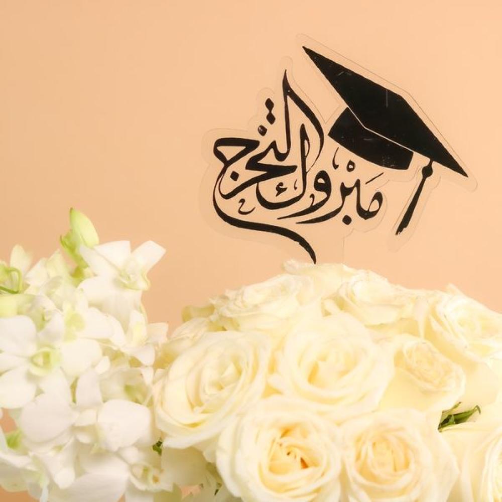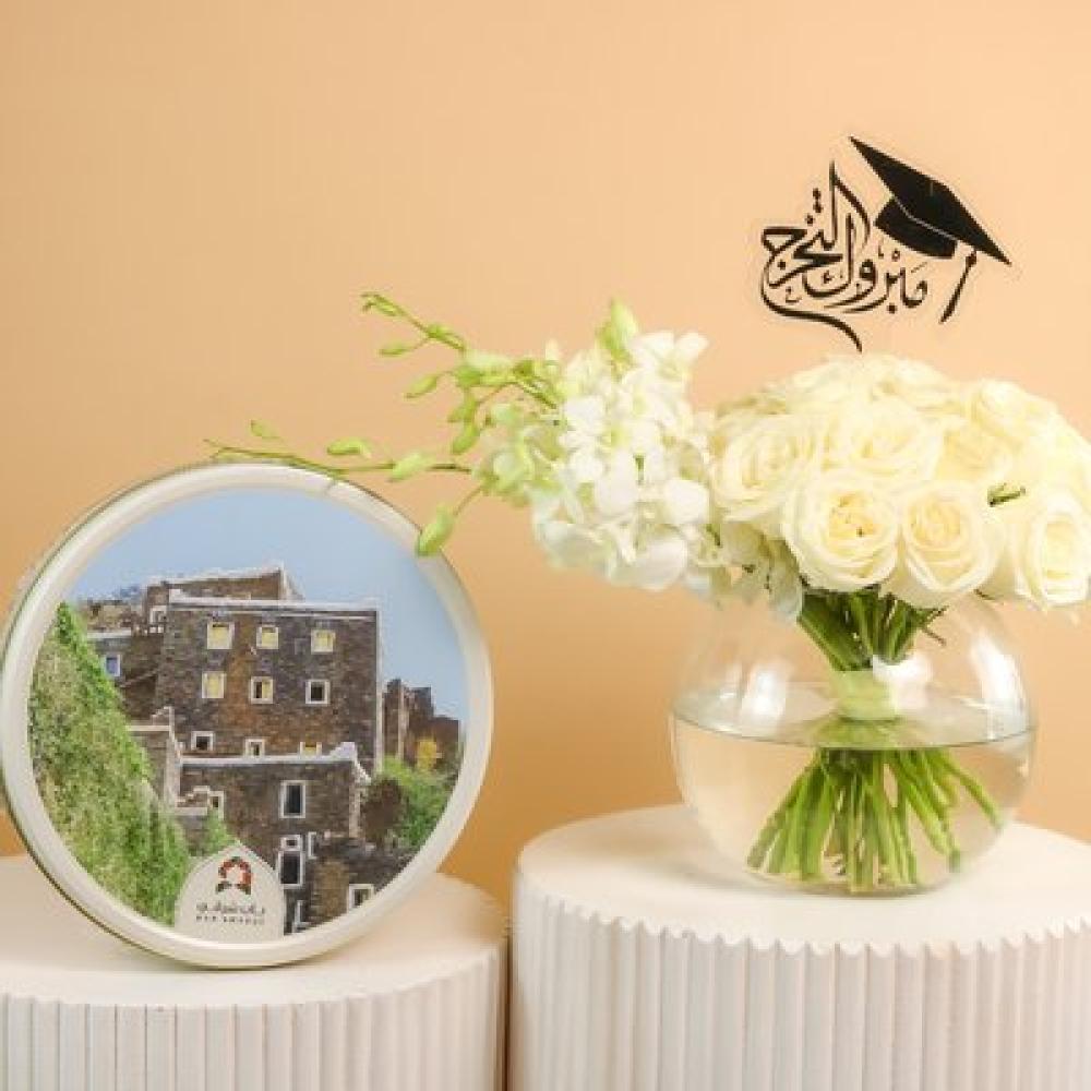 فازة بالورد الهولندي تعبّر عن أرقى المشاعر في تنسيق أنيق يجمع بين النقاء والذوق الرفيع. تتزين الفازة بورود الجوري الأبيض الطبيعي بتنسيق هادئ يبعث على الطمأنينة، وترافقها علبة فاخرة من البقلاوة الشرقية من باب شرقي، بطعمها الغني والمقرمش الذي يضفي لمسة من الفخامة. كما تتزين الباقة بتغريسة "مبروك التخرج" لتجعلها مناسبة مثالية لمشاركة لحظات الفرح والامتنان في آنٍ واحد.