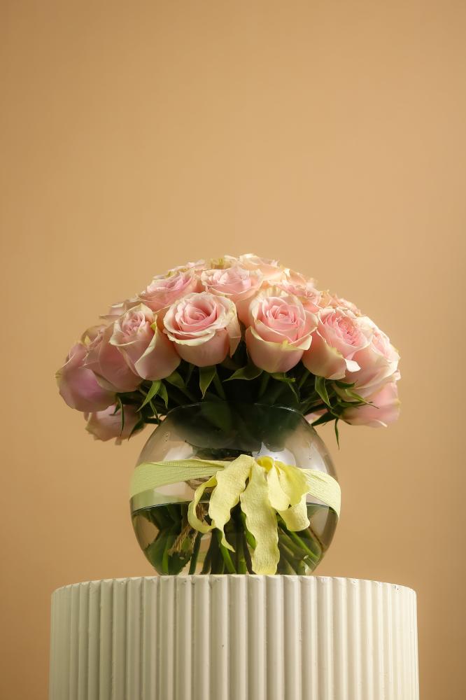 فازة أنيقة تحتضن تنسيقاً من الورد الجوري الطبيعي بلونه الزهري الناعم، تضيف لمسة دفء ورومانسية لأي مساحة. مثالية كهدية تعبّر عن الذوق الرفيع أو لتزيين منزلك بلون الحياة.