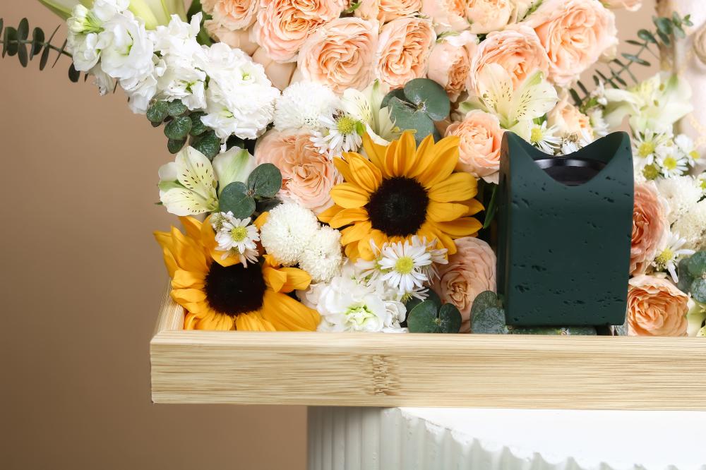 🌸 **تنسيق ورد فاخر طبيعي : ورود بلون المشمش مع زهور بيضاء ودوار الشمس الطبيعيه لأجواء راقية.