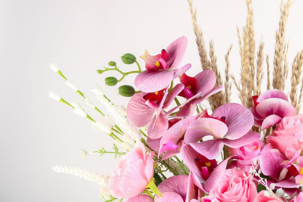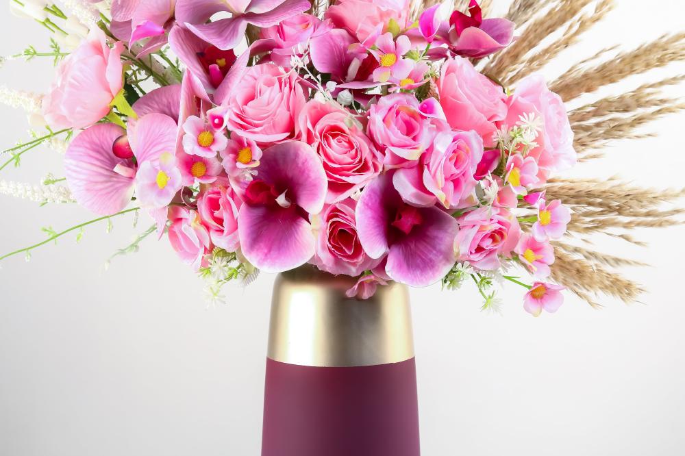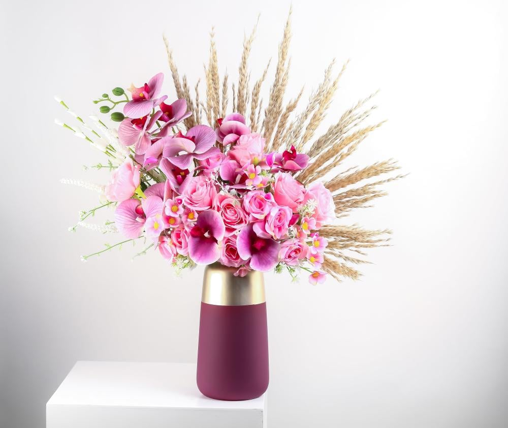 تألقي بتصميم صناعي فاخر مع مزهرية الورود هذه، التي تجمع بين زهور الأوركيد البيضاء والهيدرانجيا الوردية بلمسات أنيقة من الأعشاب الجافة، لتضفي جمالًا مميزًا ورفاهية على أي مكان.