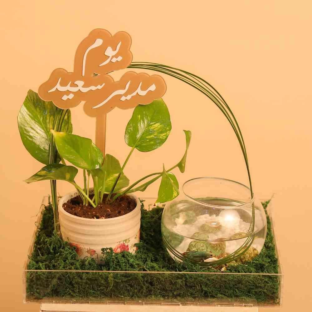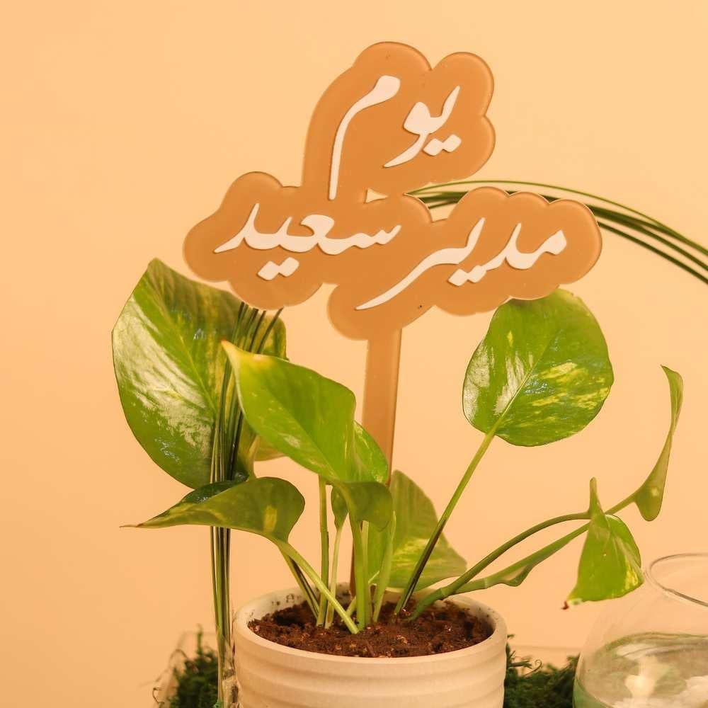 تنسيق أنيق يجمع بين نبتة بوتس طبيعية بأوراقها الخضراء اللامعة داخل أصيص سيراميكي مزخرف، مزيّن بتغريسة أكريليك “يوم مدير سعيد”، ليكون هدية مفعمة بالحيوية والتقدير في مناسبة خاصة تعبّر عن الذوق الرفيع والبساطة الراقية.