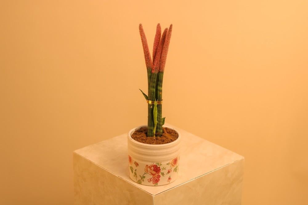 نبتة طبيعية أنيقة تتميز بأوراقها الطويلة القوية التي طليت أطرافها باللون الأحمر لتمنح مظهراً عصرياً ولافتاً يضفي لمسة فريدة من الجمال على المكان. تأتي داخل أصيص سيراميكي مزخرف برسومات ورود أنيقة تضيف لمسة من الرقي، مما يجعلها خياراً مميزاً للديكور الداخلي أو للإهداء.