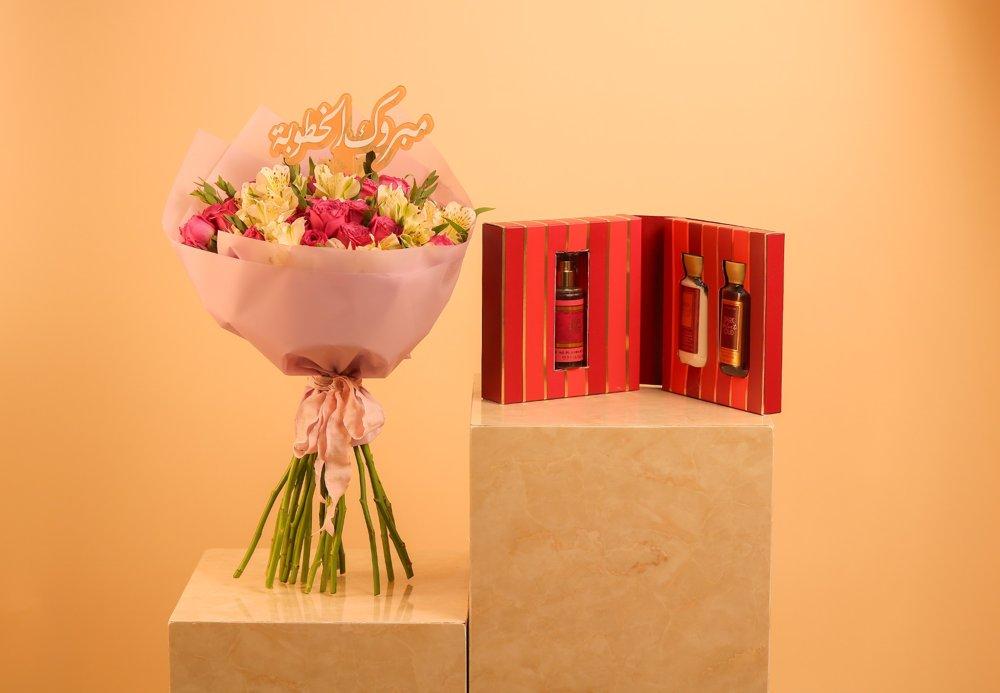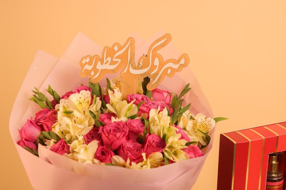 باقة ورد ملفوفة بألوان أنثوية جذابة من الورود الوردية والبيضاء، مزينة بتغريسة "مبروك الخطوبة" وشرائط حريرية، تعبر عن الفرح والرقي. تُرفق الهدية مع طقم عناية فاخر من مجموعة "ماجيك عود" يحتوي على عطر للجسم، لوشن، وجل استحمام، بتغليف أنيق بدرجات الأحمر والذهبي. هدية مثالية للاحتفال بمناسبة الخطوبة وتقديمها بأسلوب راقٍ ومميز.