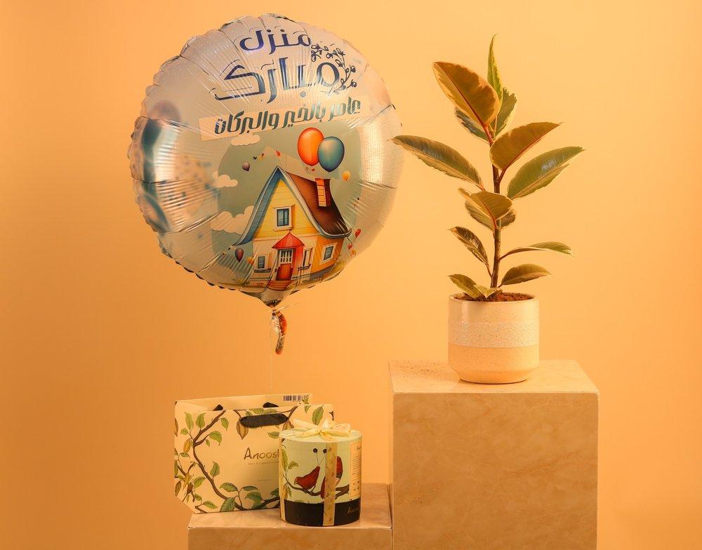 ويكتمل التنسيق مع بالون هيليوم يحمل عبارة "منزل مبارك" ليمنح الهدية طابعًا مميزًا مليئًا بالبهجة والتهاني.
