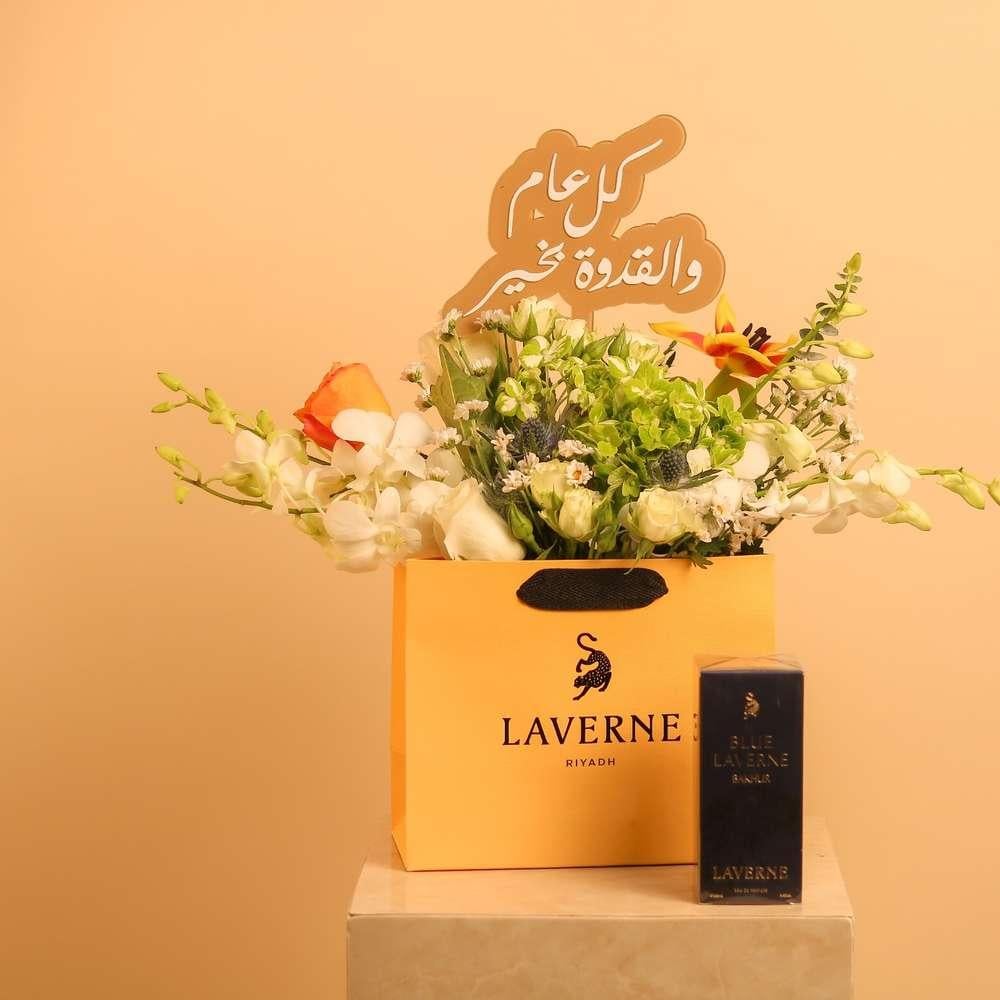 تنسيق أنيق يجمع بين الزهور الطبيعية بدرجات الأبيض والأخضر مع لمسة من الزهور البرتقالية لإضفاء الحيوية، داخل حقيبة لافيرن الفاخرة بلونها الأصفر المميز، ومرفق بعطر بلو لافيرن الأصلي بتصميمه الكلاسيكي الأنيق. يعلوه تغريسة أكريليك “كل عام والقدوة بخير” ليكون هدية تعبّر عن الامتنان والتقدير بأسلوب راقٍ ومترف.