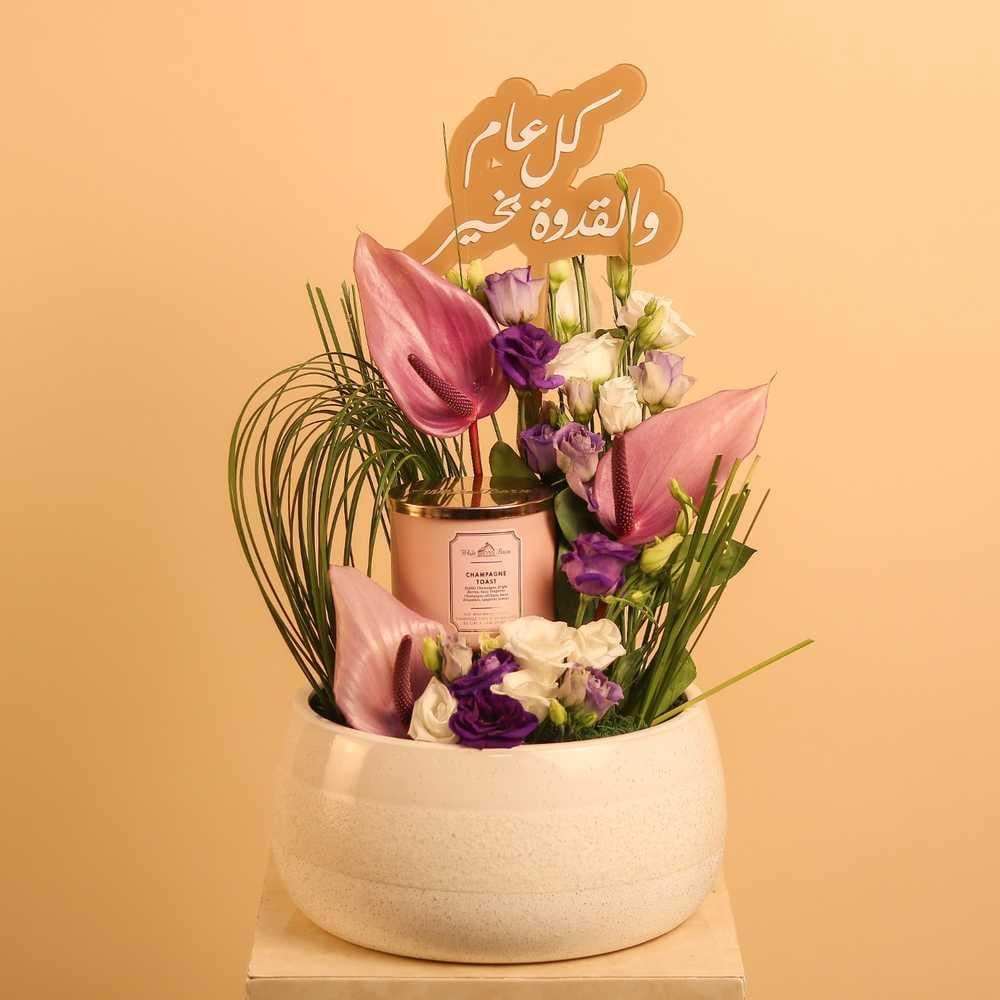 تنسيق راقٍ يجمع بين الزهور الطبيعية بدرجات الوردي والبنفسجي مع لمسة أنثوية فخمة، تتوسطه شمعة فاخرة من فيلا جاسمين – شامبين توست داخل فازة سيراميكية دائرية بلون عاجي أنيق، ومزيّن بتغريسة أكريليك “كل عام والقدوة بخير”. هدية فاخرة تعبّر عن التقدير بأسلوب ناعم ومميز.