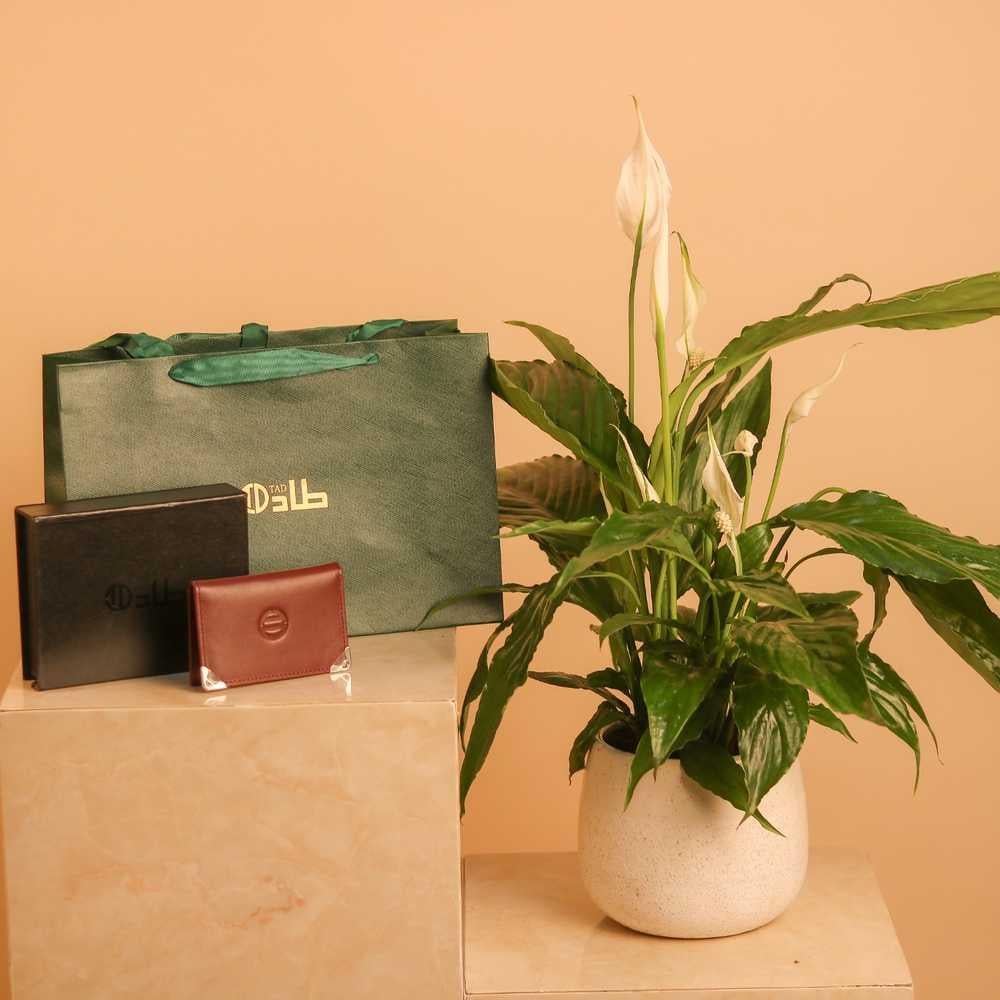 نبتة سباثيفيلوم طبيعية – أصيص سيراميك – محفظة جلد طبيعي من علامة طاد – حقيبة هدايا فاخرة